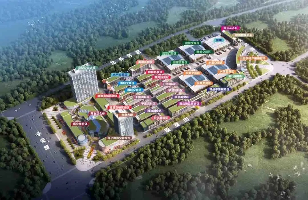 孝義農產品大市場位于城市主干道永安路與崇賢街交匯處,項目總投資10億元,占地面積約220畝,總建筑面積約17萬㎡,涵蓋了農產品交易區(qū)、農特優(yōu)展銷區(qū)、商務辦公區(qū)、倉儲加工區(qū)、冷鏈物流區(qū)、配套服務區(qū)六大功能區(qū)。項目建成后,將成為集農產品展覽交易、電子商務、電子結算、加工配送、凈菜加工、冷鏈物流、質量檢測、信息發(fā)布、創(chuàng)業(yè)孵化、金融服務、休閑娛樂等功能為一體的現(xiàn)代化大型綜合服務平臺。