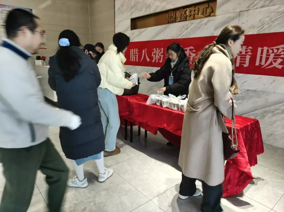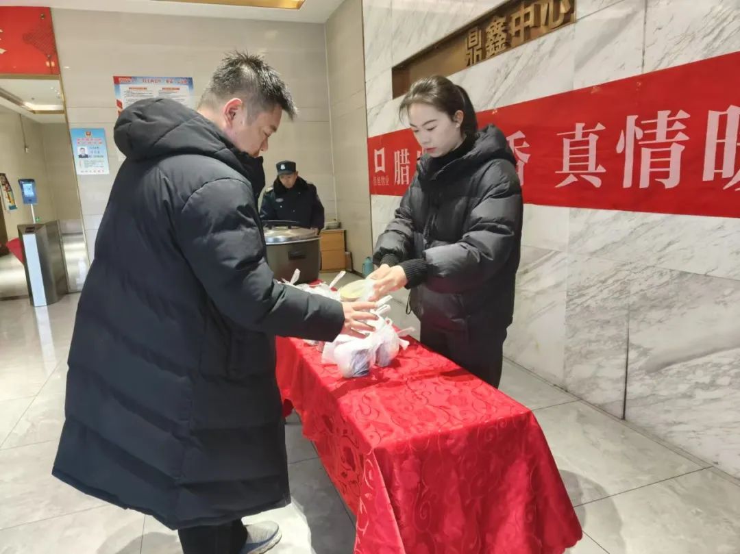 2025 年1月7日,臘八節(jié)當(dāng)天,鼎鑫中心 A 座大廳內(nèi)洋溢著溫暖與歡樂。佳旭物業(yè)精心籌備的 “暖心送粥 + 雞蛋” 活動在這里溫情上演,為每一位路過的業(yè)主送上了一份濃濃的節(jié)日關(guān)懷。